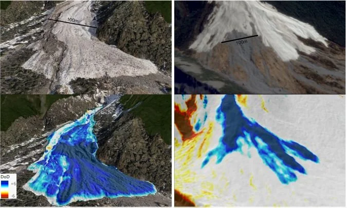 A widespread avalanche cycle in New Zealand’s Aoraki Mount Cook National Park in July 2022 generated some of the largest avalanches observed in the park in decades. A UAV survey commissioned by the Department of Conservation mapped the debris from a large snow avalanche close to Mt Cook Village where a berm was recently constructed to divert avalanches away from roads and buildings. A DJI Matrice 300 series UAV, with real-time kinematic (RTK) positioning and DJI L1 Lidar sensor, mapped 35ha with 531 points/m2. The 0.5m DSM was differenced with a 2m SPM DSM derived from Pléiades PHR to estimate the volume of avalanche debris (175,860 ±11,386m3), which was used to calibrate the RAMMS model and assist in the assessment of the risk posed to the village by future avalanches. Figure 5 shows orthoimages and example DoDs from two avalanche events in Aoraki Mount Cook National Park, as measured by UAV-Lidar in July 2022 and SPM – a 2m DSM generated from 0.5m SkySat imagery in October 2021. The UAV-Lidar point cloud can be efficiently and interactively visualized thanks to webGL platforms such as Potree.